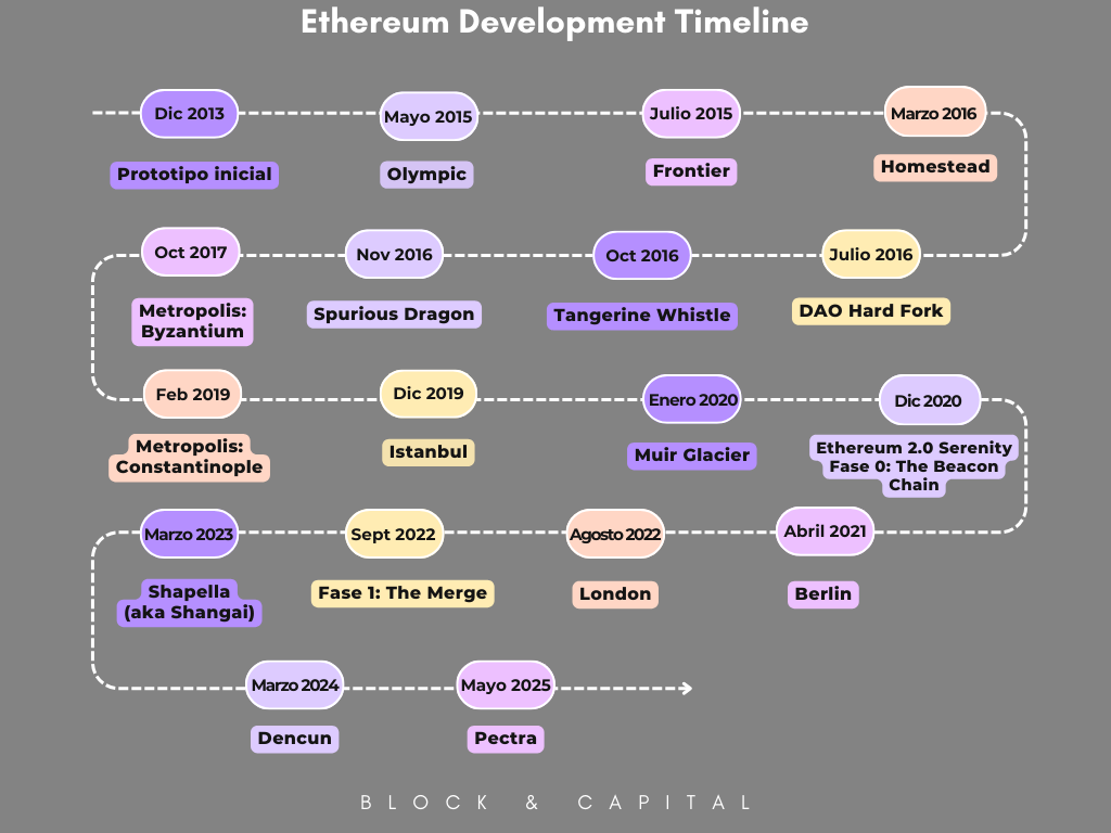 - Pectra: It is the most significant upgrade since The Merge and combines the Prague (execution layer) and Electra (consensus layer) proposals, introducing 11 EIPs. Key changes include account abstraction (EIP-3074), which will enable smoother user experiences; improvements to temporary smart accounts (EIP-7702); an increase in the staking limit per validator to 2,048 ETH (EIP-7251); and greater efficiency in transactions and validator exits. Additionally, it doubles the blob capacity per block, optimizing the scalability of L2 solutions and laying the groundwork for a more accessible, efficient, and scalable Ethereum.